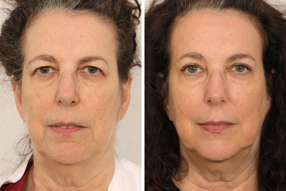 Pictured here is a 57 year old woman who came to see for help with the appearance of her eyes. She felt that she looked tired all the time despite getting good sleep and taking care of herself. She noticed drooping of her upper eyelids, excess skin and dark circles on her lower lids.